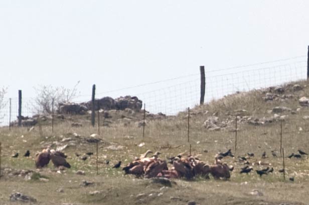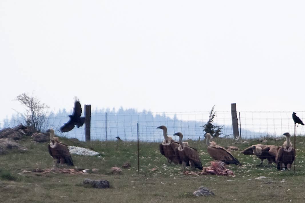 beim Näherkommen: die Rabenkrähen fliegen plötzlich weg und auch die Geier haben zu fressen aufgehört und schauen alle in eine Richtung (Der Fotograf war noch ca. 200m weit weg.) |