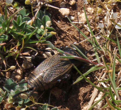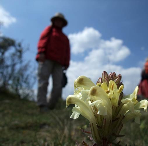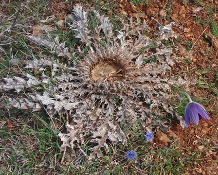 Orchideenwiese mit Küchenschellen | eine Art riesige Silberdistel | eine Art Tannenbaum mit Blüte | eine Grille |