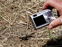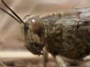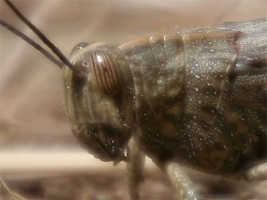 die Digitalkamera. Also für eine Heuschrecke riesengross. Sie hat sehr schöne gestreifte Augen
