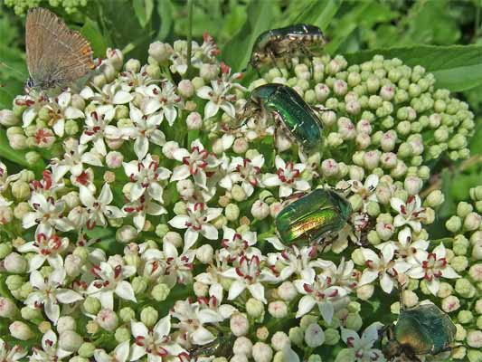 Skarabäen-Vollversammlung auf Zwerg-Holunder (Sambucus ebulus) Le Sureau hièble (Danke an Susanne für die Hilfe bei der Artbestimmung) → Wildblumen im Ardèchegebiet |