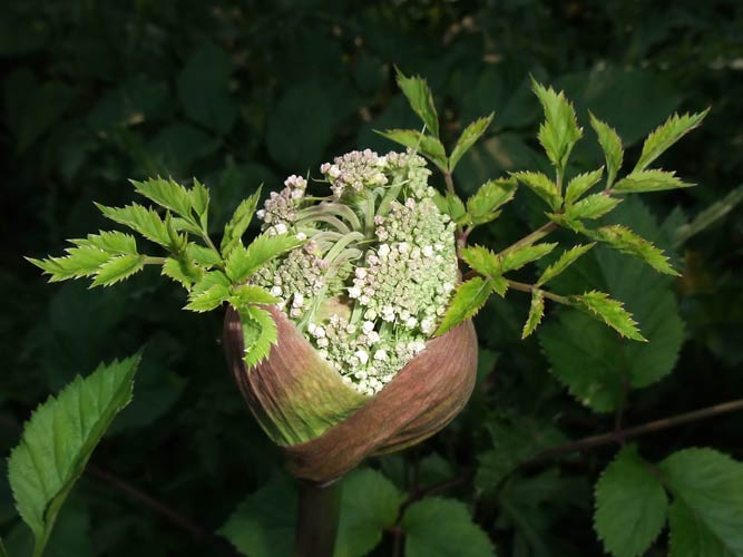 typisch für die Wald-Engelwurz (Angelica sylvestris): aus der Hülle wächst ein kleiner Ast |