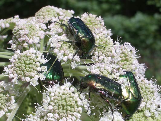 vier goldglänzende Rosenkäfer (Cetonia aurata) Wald-Engelwurz (Angelica sylvestris) ...mehr über unsere → Käfer im Glemstal |