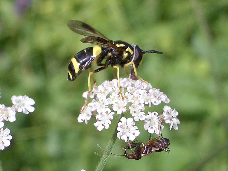 Klettenkerbel (Torilis japonica) und eine Zweiband-Wespenschwebfliege (Chrysotoxum bicinctum) und ein unbestimmtes Insekt ...mehr über unsere → Schwebfliegen im Glemstal |