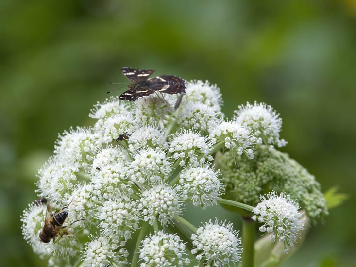 oben Landkärtchen (Araschnia levana) links Keilfleck-Schwebfliege (Eristalis pertinax) auf Wald-Engelwurz (Angelica sylvestris) ...mehr über unsere → Edelfalter im Glemstal → Schwebfliegen im Glemstal |