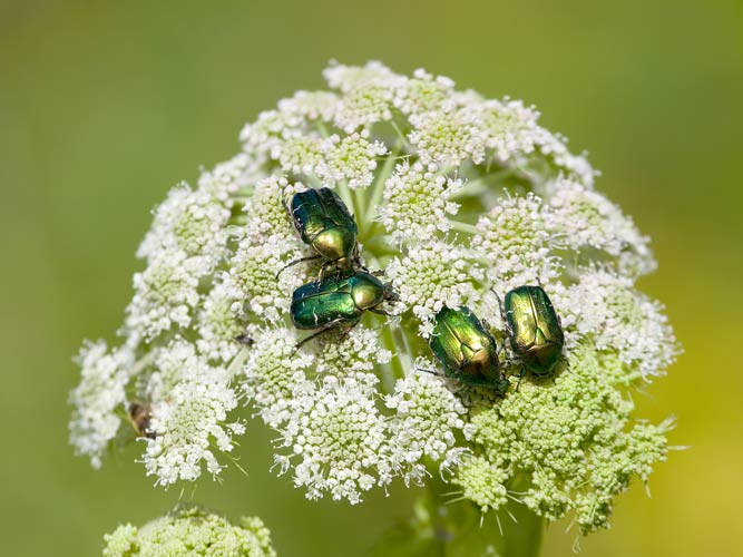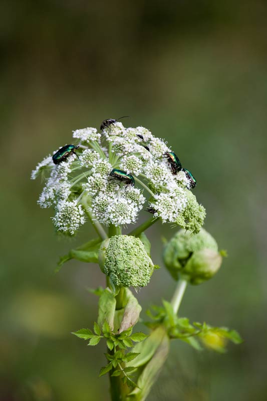 Wald-Engelwurz (Angelica sylvestris) schön arrangiert mit goldglänzenden Rosenkäfern (Cetonia aurata) ...mehr über unsere → Käfer im Glemstal |