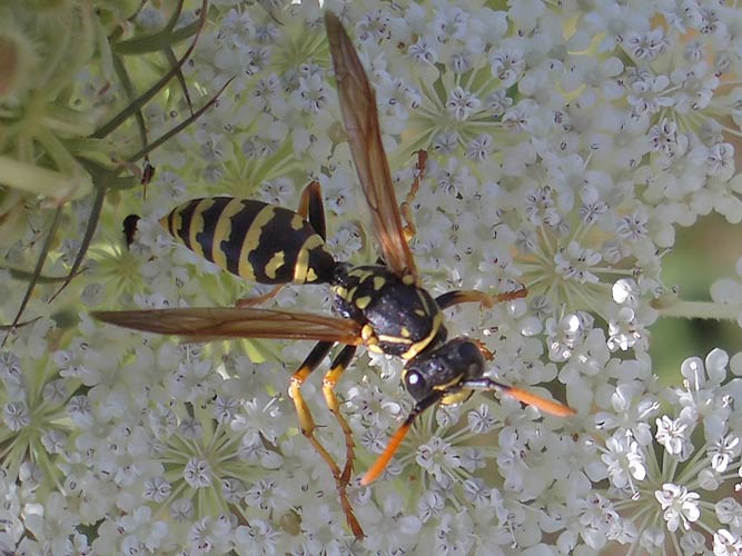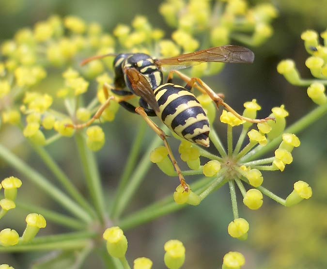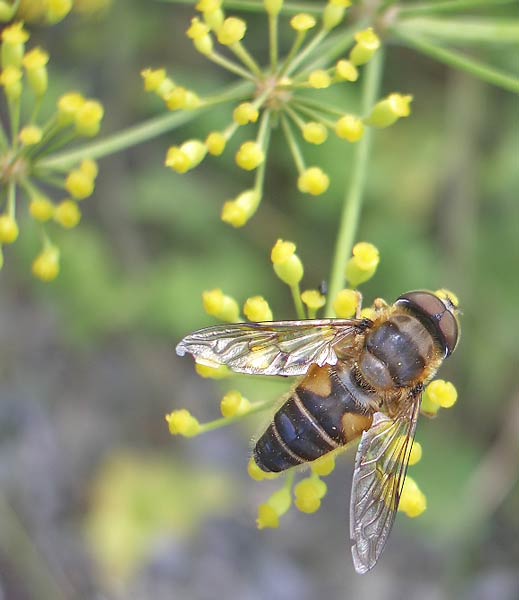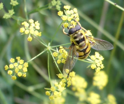 sichelblättriges Hasenohr (Bupleurum falcatum) mit Gemeiner Dolden-Schwebfliege (Myathropa florea) ...mehr über unsere → Schwebfliegen im Glemstal → Siegfriedsfelsen in Markgröningen |