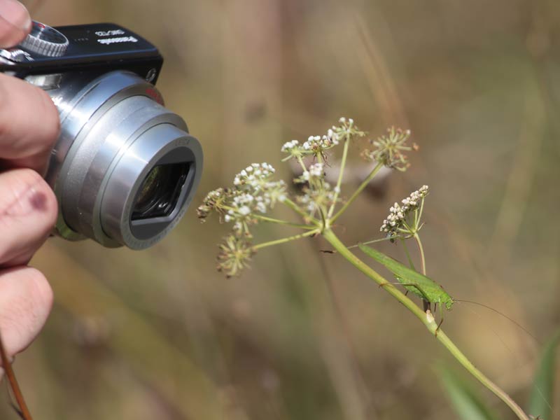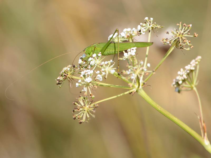 Hirsch-Haarstrang (Peucedanum cervaria) mit Gemeine Sichelschrecke (Phaneroptera falcata) ...mehr über die Bissinger → Heide am Sonnenberg → Langfühlerschrecken im Glemstal |