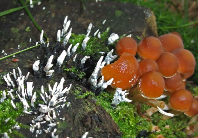 linke Seite: "Ziegenbärtchen" (weiß): Geweihförmige Holzkeule (Xylaria hypoxylon) (Danke an Rotraut Völlm für die Artbestimmung in 11/2012) Ordnung: Holzkeulenartige (Xylariales) |