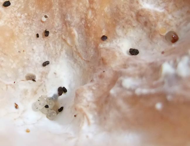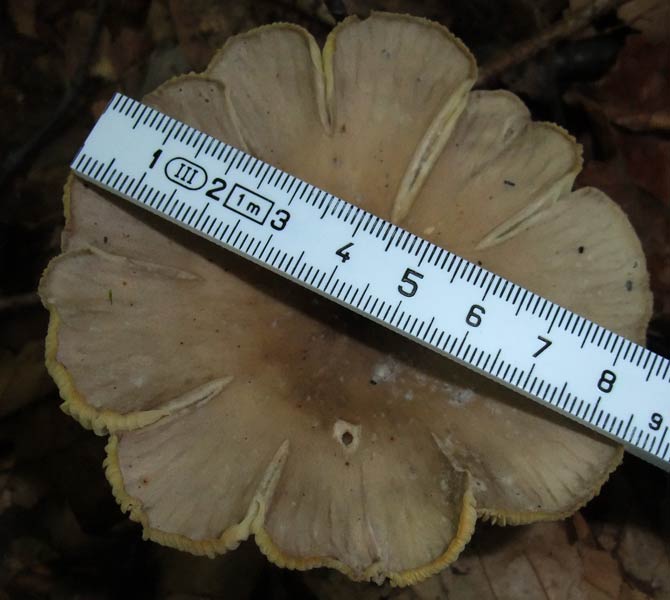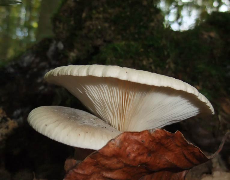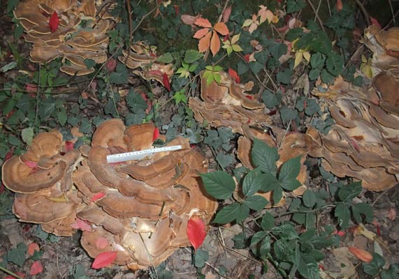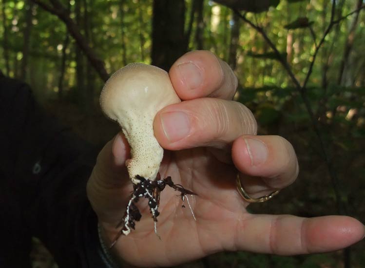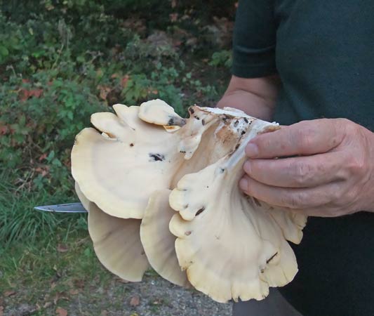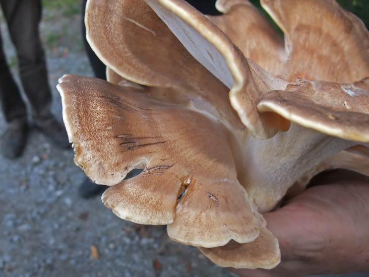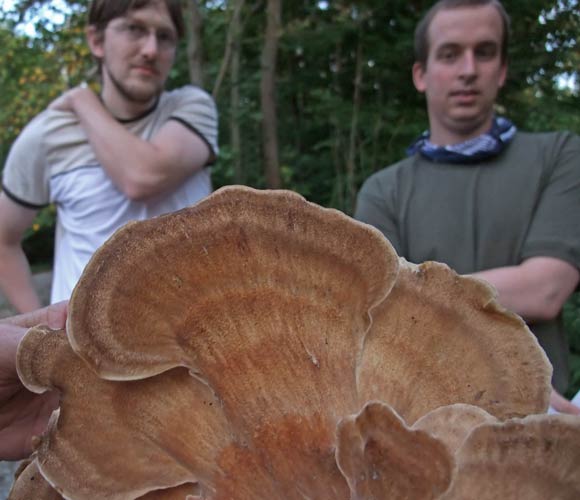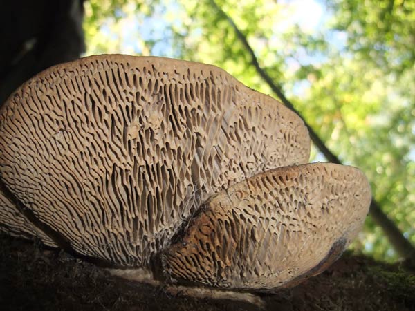ein Baumpilz von unten: er hat weder Lamellen noch Röhren sondern so eine Art Gebirgs-Schluchten ...mehr über unseren → Heimerdinger Wald |