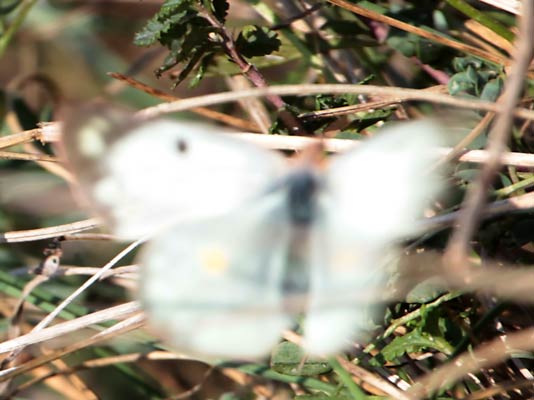 derselbe Gelbling aufgeklappt auf dem Vorderflügel ein schwarzer Fleck und auf dem Hinterflügel ein orange Fleck
