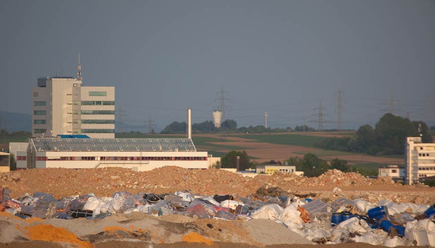 Blick zum Bosch-Hochhaus und zum Layherbau im Schwieberdinger Industriegebiet mit Deponie im Vordergrund |