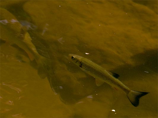 größeren Gruppen. Hinten sind zwei Karpfen. Ganz vorne im Bild könnte eine