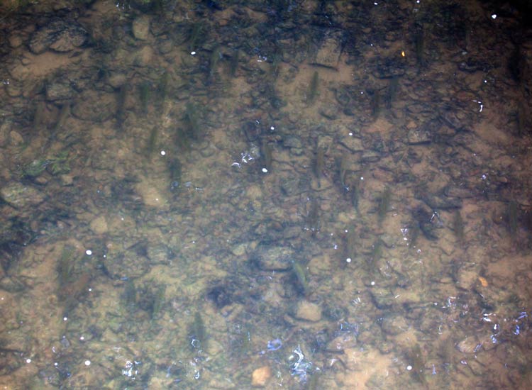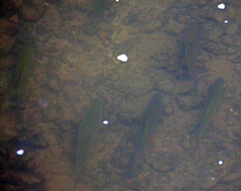 | sehr große Fische ca. 80cm im Neuen See. Hinten zwei Karpfen. | Klaus Rautenstrauch hat an dieser Stelle im Leudelsbach schon Groppen (Cottus gobio) gesehen | und zeigt Manfred Rothenpieler eine Stelle, wo sich gerne Gründlinge (Gobio gobio) sonnen |