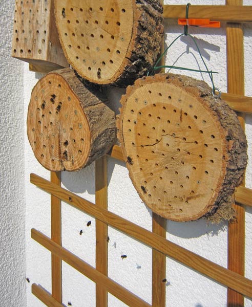 aufgehängt. Wird offenbar gut von Wildbienen angenommen, denn der Specht hat