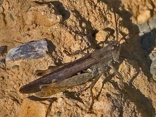 Hier das Foto von Andreas aus der Situation links: blauflügelige Ödlandschrecke (Oedipoda caerulescens) |