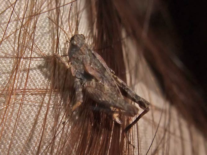 Kurzfühlerschrecke hat sich auf Kerstin Cotrus gesetzt: Säbeldornschrecke (Tetrix subulata) |