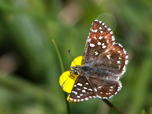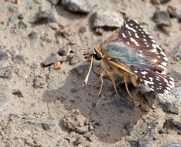 ein Falter saugt im Schlamm: Malven-Würfelfleckfalter (Pyrgus malvae) |