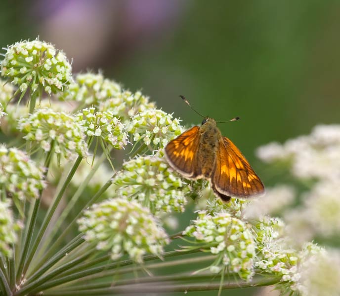 ein weibl. Dickkopffalter (es fehlt der deutliche schwarzbraune Duftschuppenstreifen der Männchen auf den Vorderflügeln) auf Waldengelwurz einem Doldenblütler ...mehr über → Doldenblütler im Glemstal |