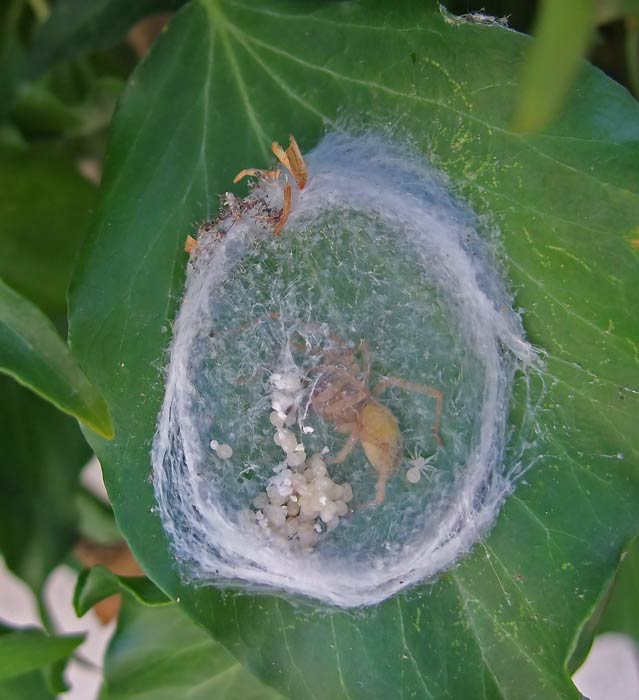 | riesige unbestimmte Spinne | diese Spinne hat sich unter einem Efeublatt quasi eingesponnen mit Spinneneiern. Eine kleine Spinne ist wohl schon geschlüpft |