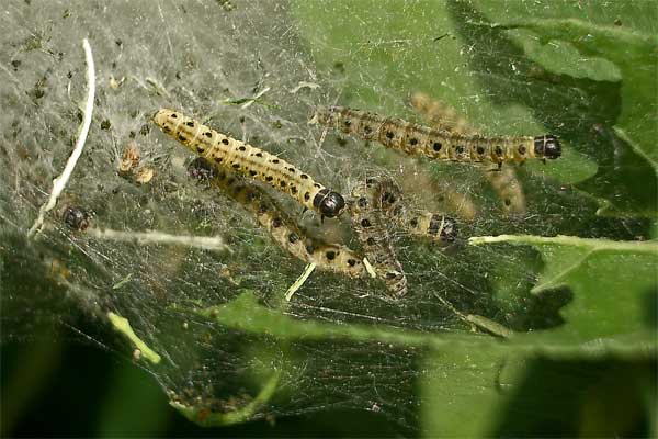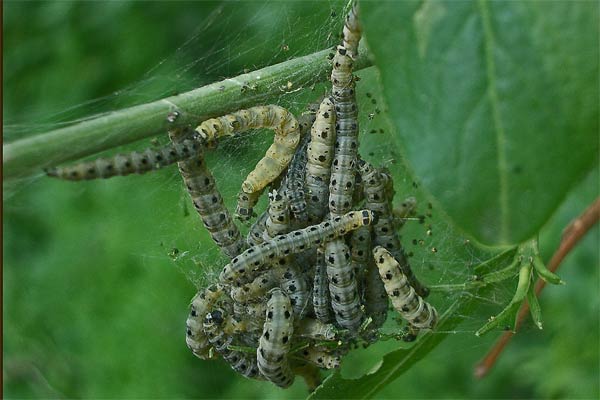 Auffällig sind die Raupen der Gespinstmotten yponomeuta evonymella die in großen schleierartigen Gespinsten an Bäumen leben.