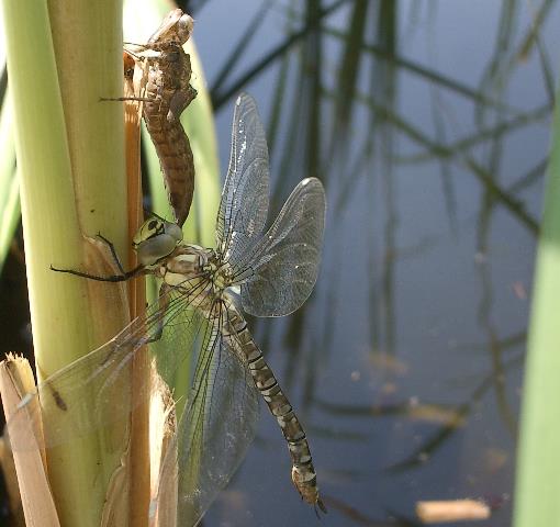 Flug. Die Imago sitzt dabei selbst im Schatten des Schilfrohrs. Dadurch sind die Flügel maximal in der Sonne |