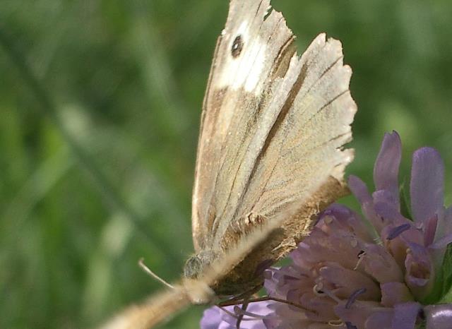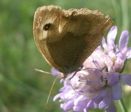 17.9.04, 15:00 gr. Wiese ein Augenfalter, baer welcher?? Großes Ochsenauge (?) (maniola jurtina) oder Braunauge (?) (lasiommata maera) neu auf Wiesenknautie (knautia arvensis) |