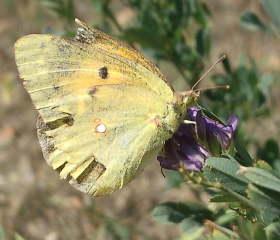 | 18.9.04, 14:00 gr. Wiese Wandergelbling (colias croceus) geschützte Art auf Wiesenknautie (knautia arvensis) |