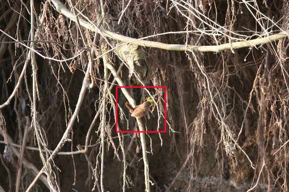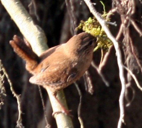 ...mehr Der Zaunkönig mit Moos vor seinem Nest direkt über der Glems. (rechts oben in der Ecke) Er mag es offenbar gerne unordentlich. Zum Vergrössern auf den Zaunkönig klicken