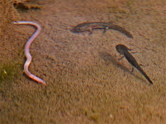 sieht man, wie die Feuersalamanderlarven im kühlen Brünnle einen Wurm angreifen.
