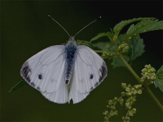 schwarzen Spitzenfleck am Vorderflügel. Das Männchen des grosen Kohlweisslings