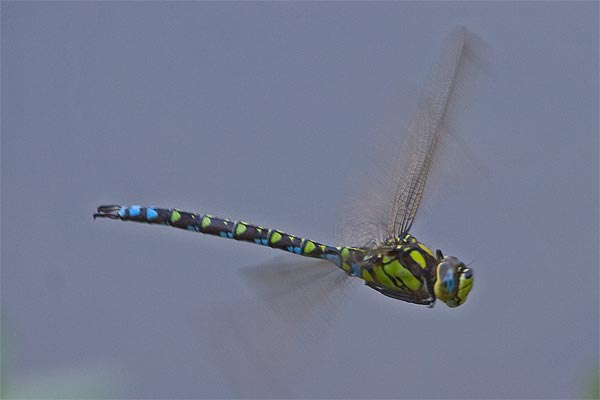aeshna cyanea im Flug (blaugrüne Mosaikjungfer, männl.) |