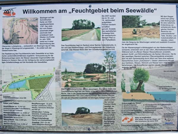 Herr Großmann von der Stadt Bietigheim hat dieses Feuchtgebiet anlegen lassen. Ohne Teichfolie und bis zu 4 m tief. Es gab dort ganz viel grauen Tonschlick ...mehr über das → Feuchtbiotop "am Seewäldle" |