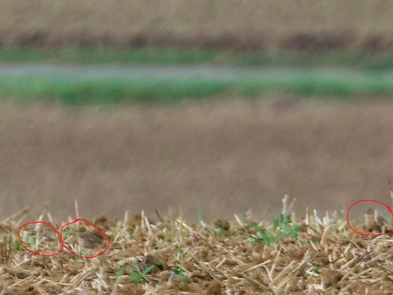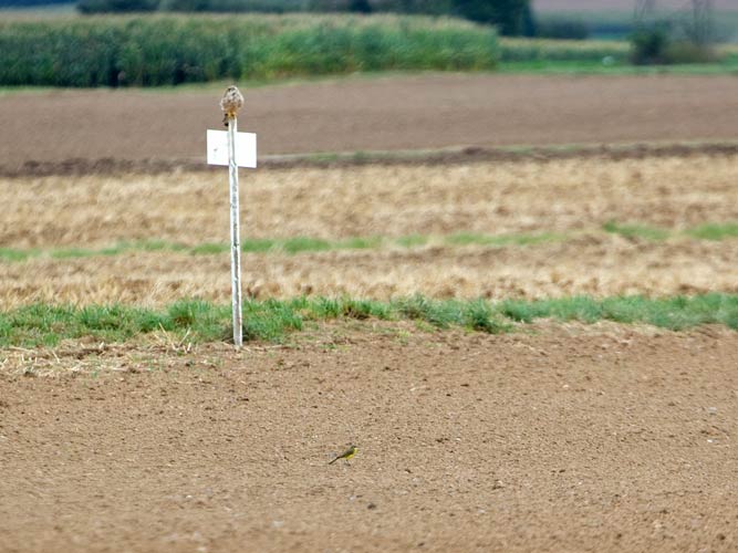 Ein kleiner Trupp von zwölf Bachstelzen, einer hellgelben Stelze und einer ganz gelbe Stelze waren auf diesem abgeernteten und sehr feinscholligem Feld auf der Höhe südlich des Schwieberdinger Golfplatzes. Vermutlich auf dem Zug und beim Rasten. Offenbar braucht man die Profile, um die Schafstelzen zu unterscheiden.