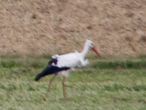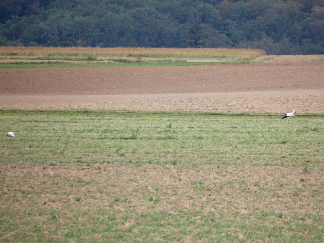 Oho! Fischadler!? Sofort am nächsten Tag morgens nach Hirschlanden gefahren. Und gleich neben der Strasse zwei Störche (!) gesehen. Hm! Was tun? Störche stehen nicht auf der Liste vom Roland Meinert und es war auch noch vor 10:00. Also nur ein kurzes Belegfoto gemacht und gleich weiter zum Mauerener Berg. Die zwei Störche stolzierten übrigens über diese Wiese. Als ich um 12:30 auf dem Rückweg noch mal vorbei kam, waren sie verschwunden.