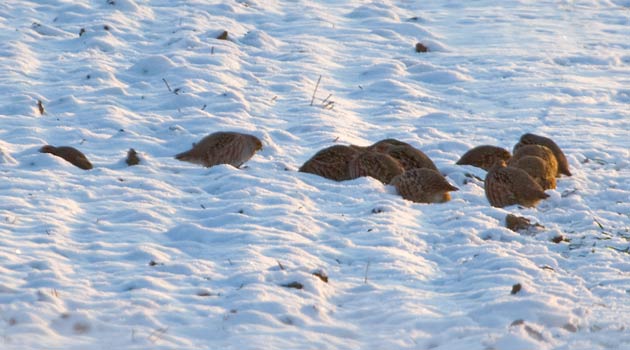 Zwölf Rebhühner im Schnee auf den