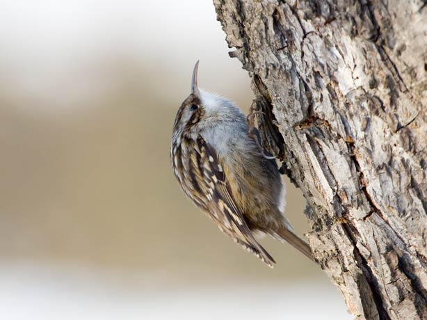 Obstbäumen am Heimbergweg auf der Suche nach Nahrung unter der Baumrinde. Der weiße Hintergrund ist Schnee → Garten-Baumläufer im Glemstal |