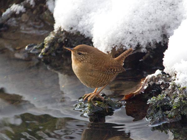 Der Zaunkönig (Troglodytes Troglodytes) steht bei -5°C im eiskalten Leudelsbach → Zaunkönig im Glemstal |