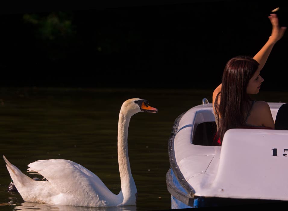 der männliche Höckerschwan am Boot
