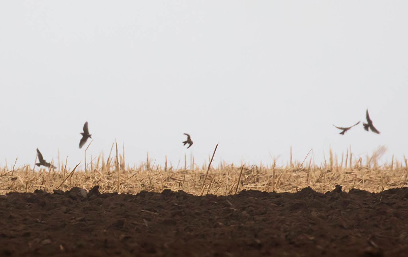 ein Trupp Vögel auf dem Acker. Vielleicht Feldlerchen ... mehr über die → Feldlerche in Hemmingen |