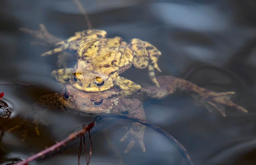 Erdkrötenpaar arbeitet an der Arterhaltung im Solitudeweiher. Viele Erdkröten waren heute am Laichen in allen besuchten Gewässern ... mehr über die → Erdkröte im Glemstal |