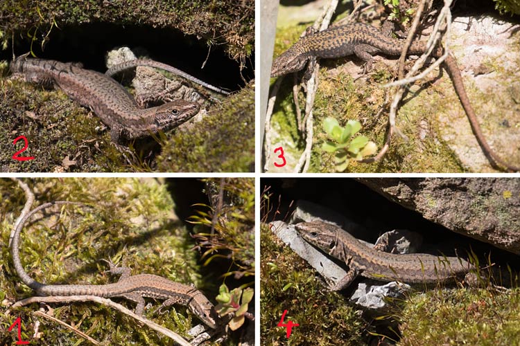 die vier Mauereidechsen in der Trockenmauer im Norden vom Birkenrund. Von links