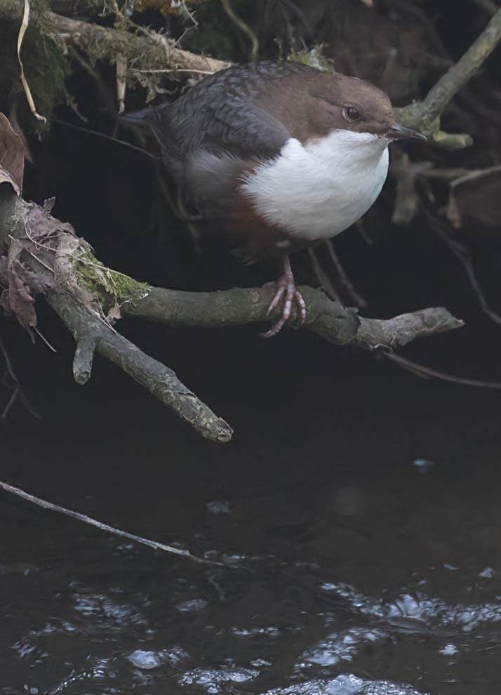 Am Abend nach unserer Vogelstimmenführung sitzt eine Wasseramsel am Schwall beim Trafoturm
