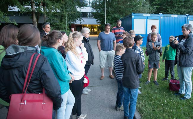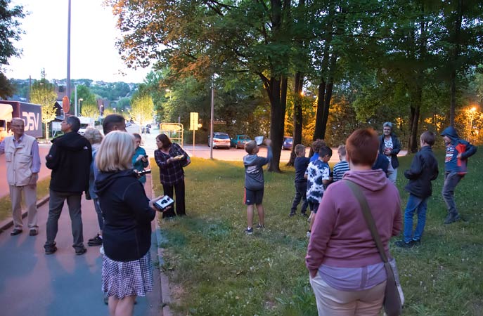 | Ewa erklärt die Benutzung der Fledermausdetektoren. Mit Ultraschalldetektoren können wir die Fledermäuse hören | 2017 hören wir nur Zwergfledermäuse. In allen Vorjahren gab es auch große Abendsegler zu hören |