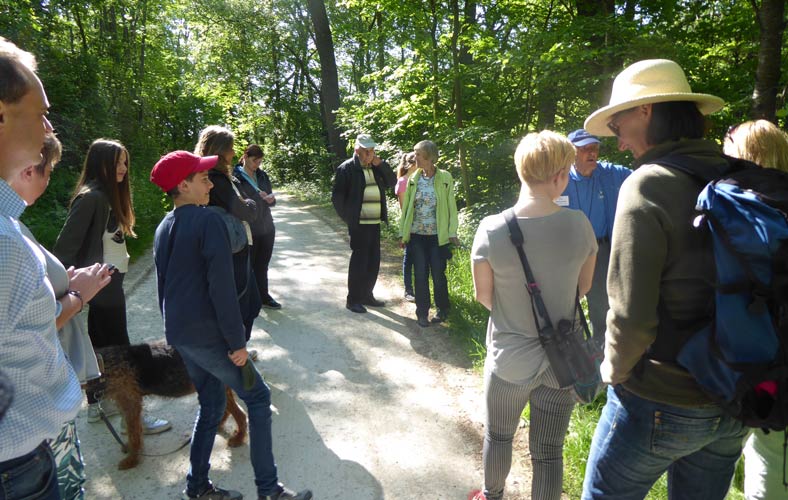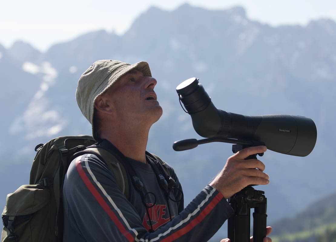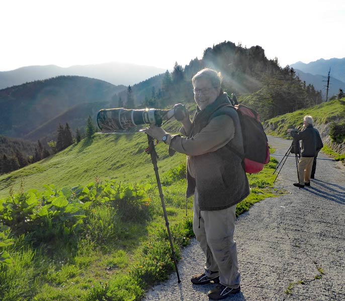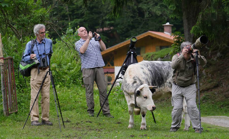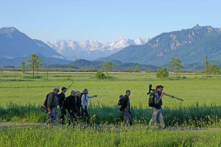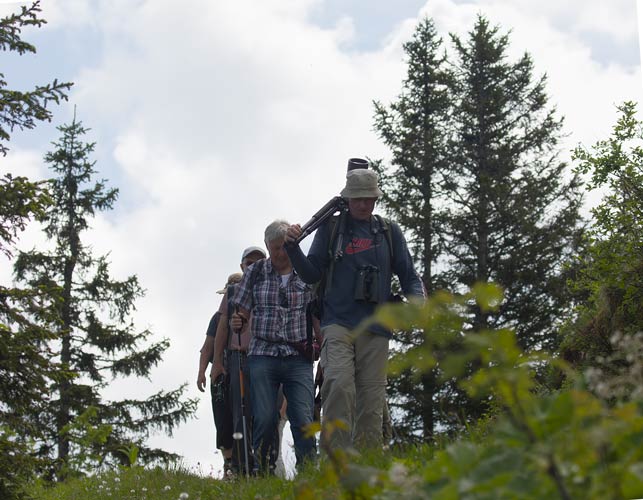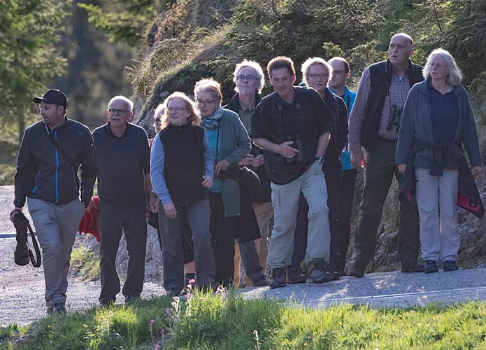 | Birdingtoursgruppe sieht balzenden Birkhahn |
