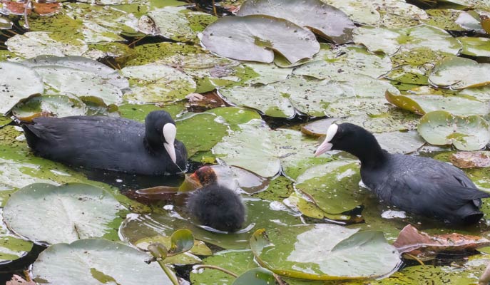 Familie von Blässhühner mit einem Jungen am