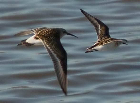 am Bürzel sieht man Unterschiede: Sichelstrandläufer und Zwergstrandläufer fliegen gemeinsam (Danke an Jochen Völlm für die Artbestimmung) |