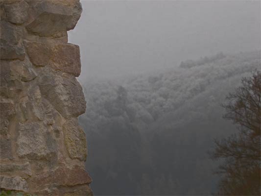 | Die Bergkuppen hinter der Sprengelburg sind mit Rauhreif verzuckert | An der Sprengelburg ist ein Schatz versteckt. Details siehe bei www.geochaching.de |